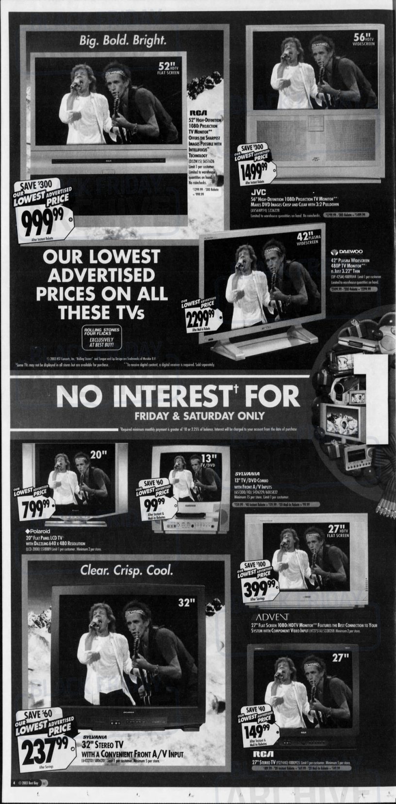 Когда ЖК-телевизоры только появились, они были дорогим, были редметом роскоши. В этой рекламе «Чёрной пятницы» 2003 года розничная сеть Best Buy продаёт 20-дюймовый ЖК-телевизор (с «ослепительным разрешением 640×480») за 800 долларов. В той же рекламе 27-дюймовый ЭЛТ-телевизор продаётся за 150 долларов…