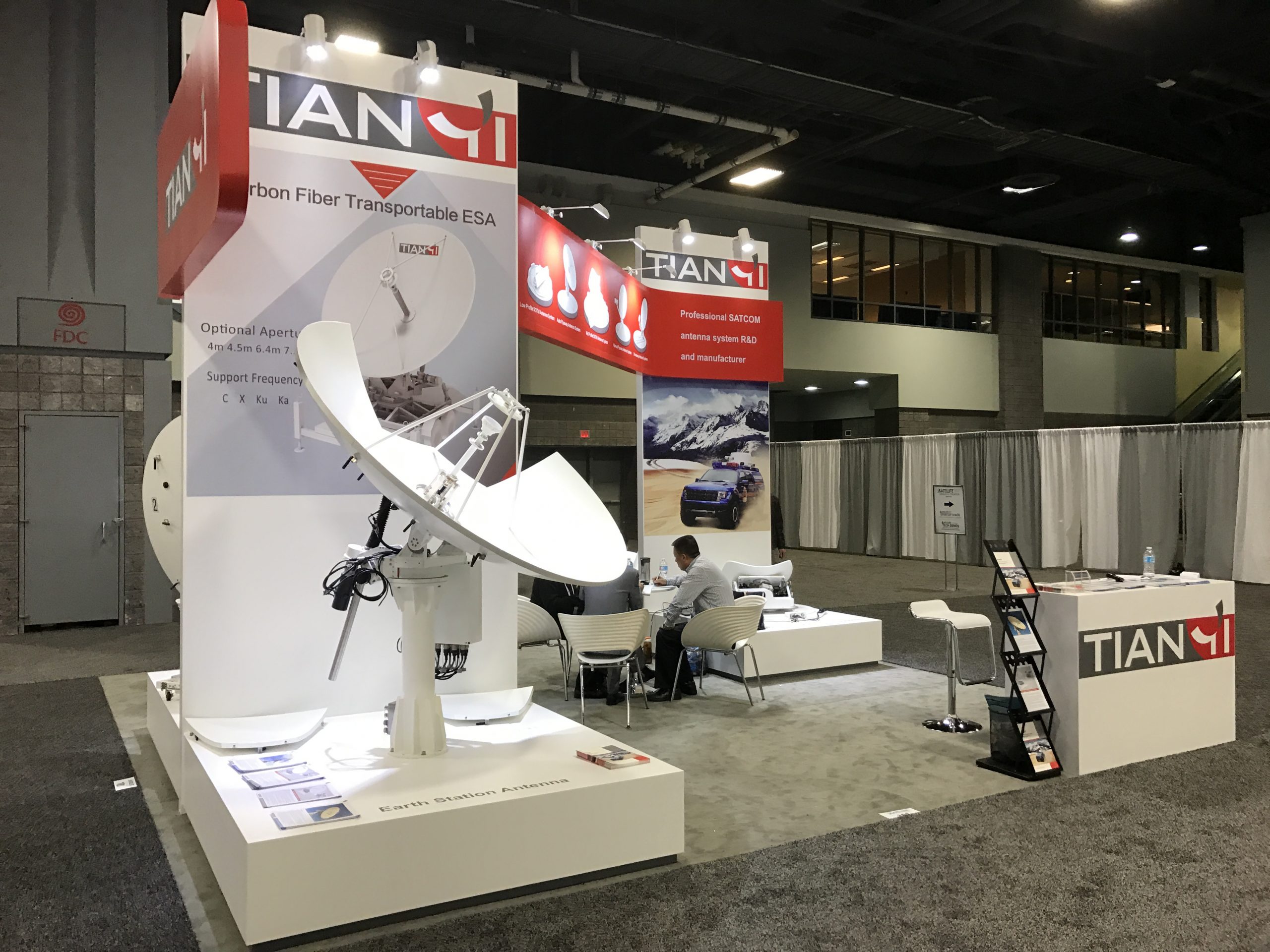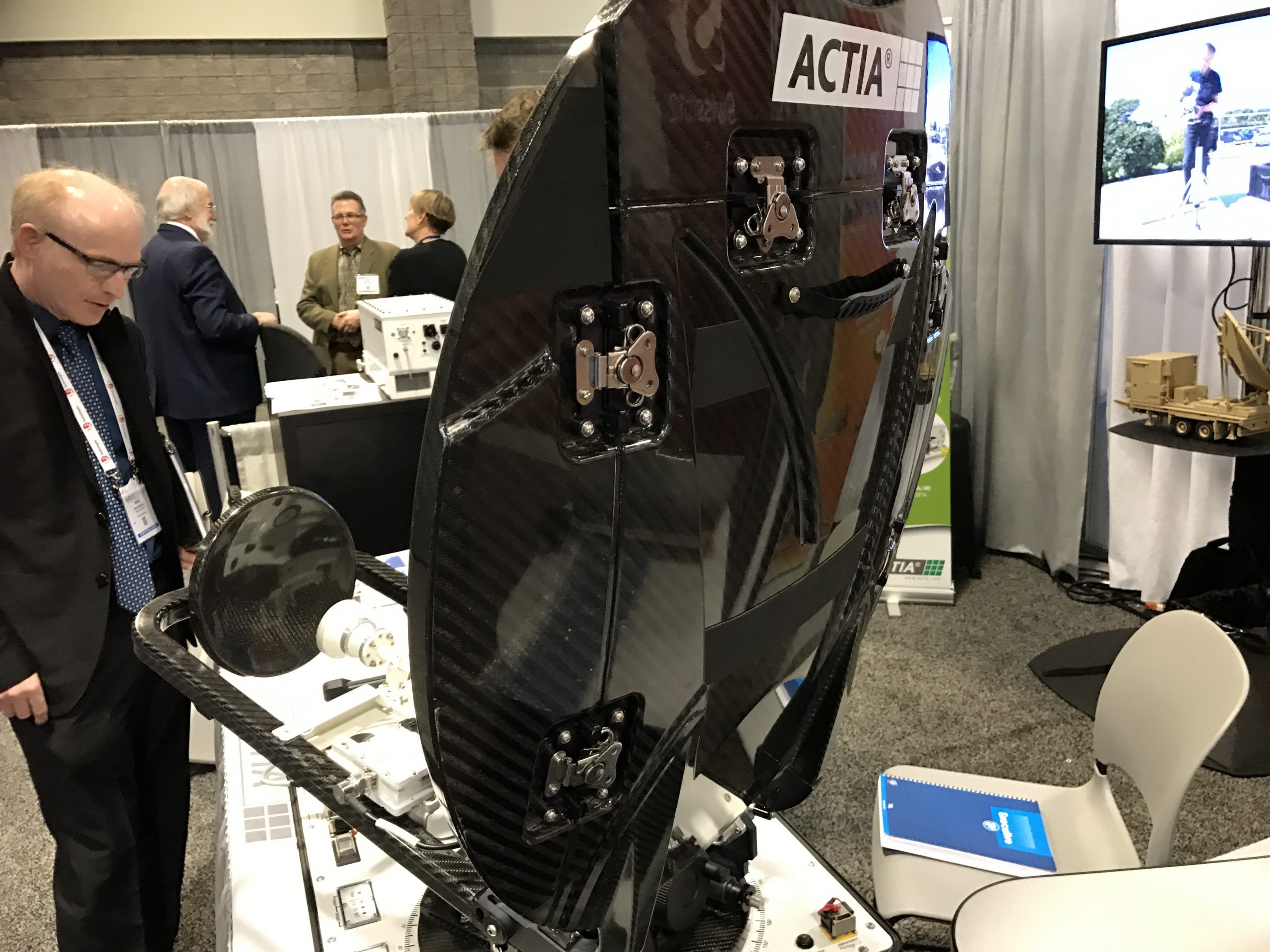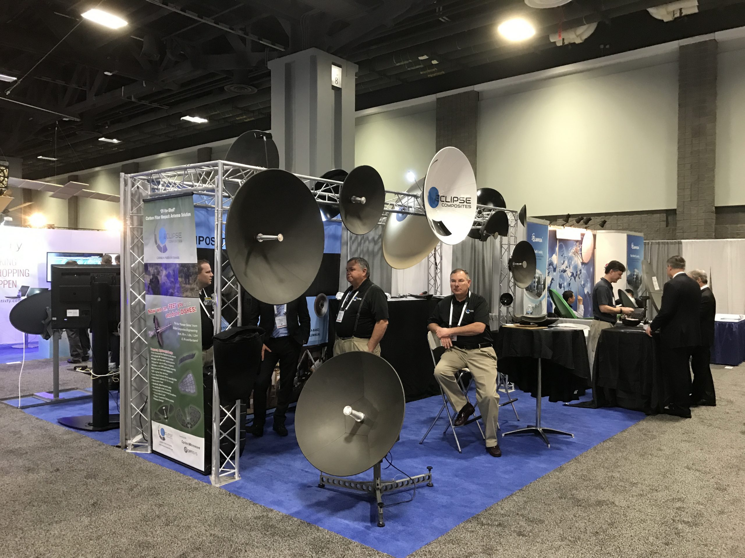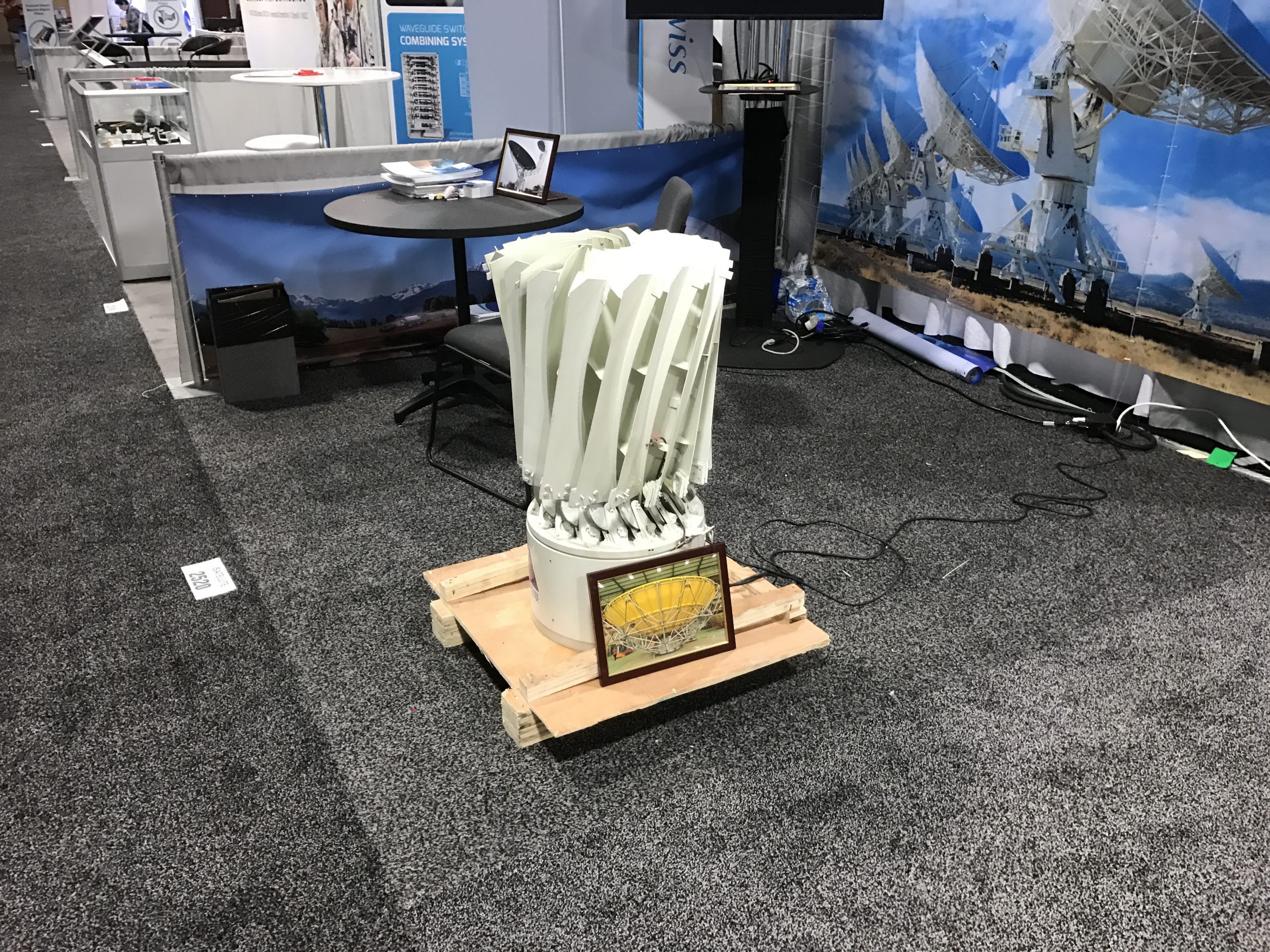 И для способствования разрешения такой проблемы есть, например, Waterproof Dish Mounts — частная компания (изображение их павильона на фото ниже). Отец и двое детей, разработавшие новую систему, дающую возможность закрепить антенны-тарелки на покатой, наклонной крыше, тарелки собранные из отдельных элементов.