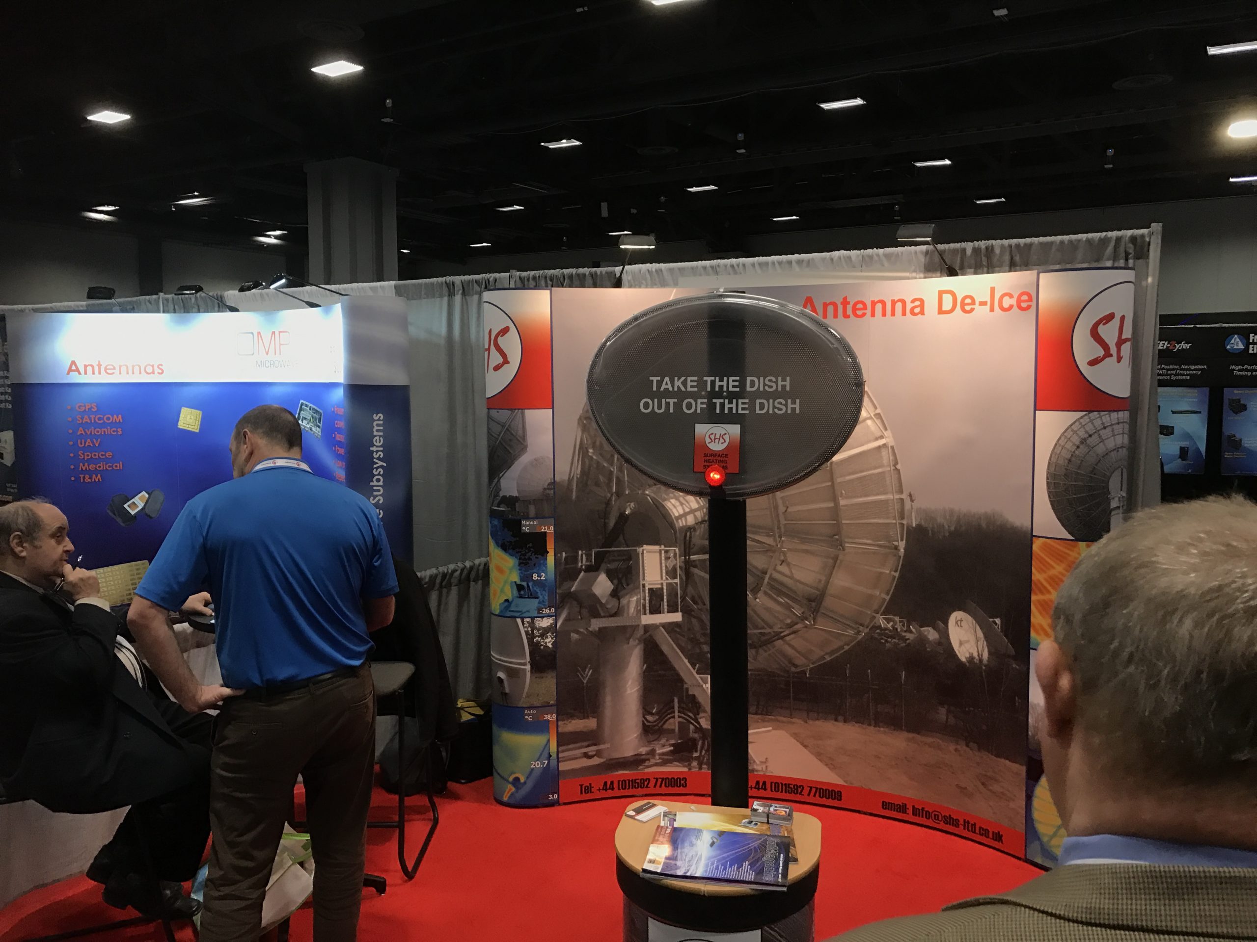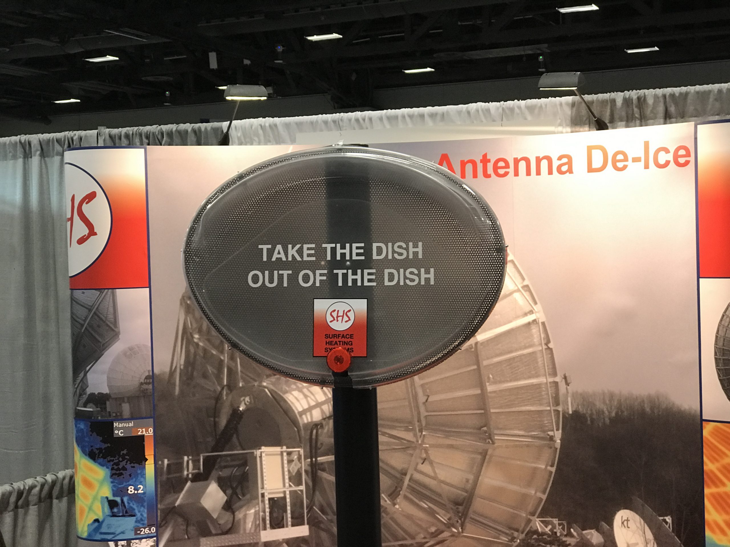 На мониторе на павильоне этой компании (как вы видите на фото) демонстрировалась заснеженная тарелка, в которой, естественно, сигнал деградировал и не очень эффективно принимался по погодным условиям. Тут же на выставке разговорились с владельцем Walton De-Ice. Т.к. я из России то было понятно, что у нас может быть общий интерес в вопросе борьбы со снегом на антеннах-тарелках. Я спросил, насколько это типично и актуально у них в Америке – борьба снегом на спутниковых антеннах. И этот человек (насколько я понимаю, его фамилия Волтен, поскольку компания в его честь называется), сказал что, типа, не переживай, в нашем штате со снегом и льдом зимой все нормально. От недостатка этих вещей не страдаем совершенно.